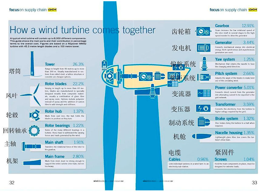 通常風(fēng)機(jī)(三葉片)的成本構(gòu)成中:齒輪箱占13%、葉輪占22%